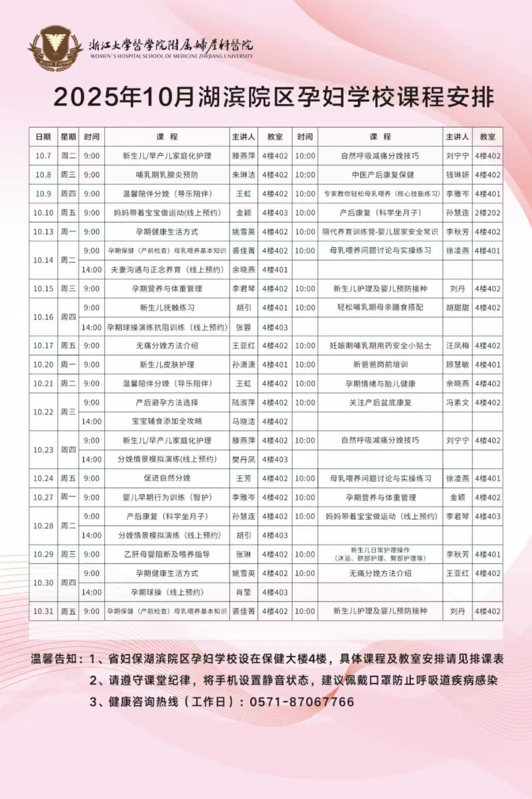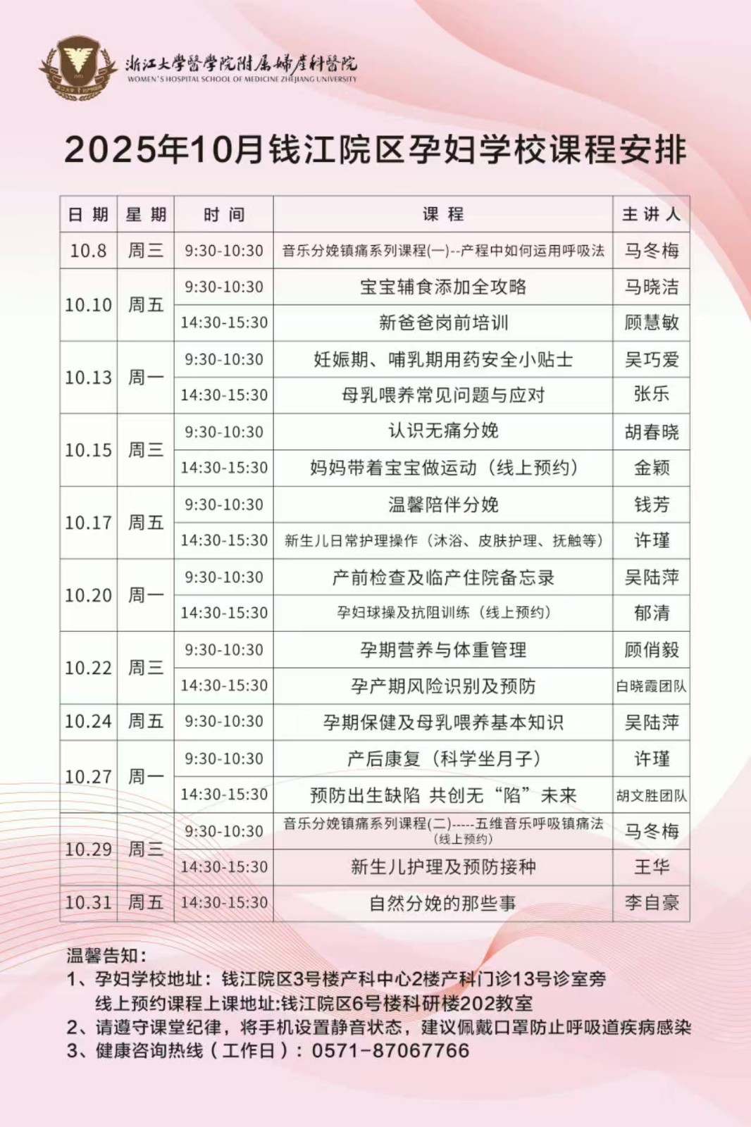 2025年10月—浙大妇院孕妇学校课程安排