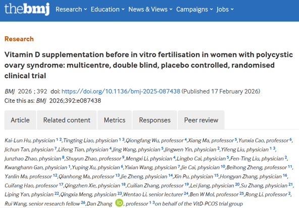 近日,浙江大学医学院附属妇产科医院在国际顶级医学期刊《英国医学杂志》(The BMJ)上发表论文,为这个备受关注的问题提供了循证答案。这项由浙大妇院张丹教授团队领衔,悉尼大学NHMRC临床试验中心王睿高级研究员团队、北京大学第三医院李蓉教授团队等共同完成的研究发现:对于准备接受体外受精-胚胎移植辅助生殖技术的“多囊女性”,术前常规补充维生素D虽能显著提升血液中的维生素D水平,但并未显著提高最终的活产率。