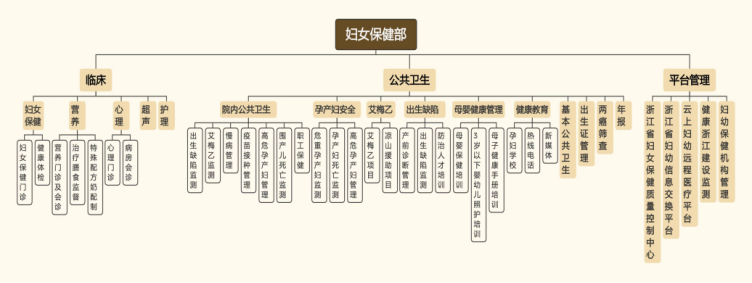 浙大妇院妇女保健部集妇女保健、科研和教学于一体,牵头全省妇女保健公共卫生项目管理20余项,承担全省妇女保健工作业务指导与技术培训,协助卫生行政部门提供妇幼卫生决策支持。以全生命周期保健服务理念,开设妇女保健中心、健康管理中心,提供特色鲜明的妇女全生命周期保健专科门诊,包括青春期保健、孕前保健、孕期营养管理,更年期保健、心理保健及女性特色健康体检服务。已获得国家孕产期保健专科特色,更年期保健特色专科门诊等荣誉称号。