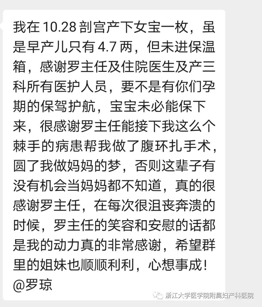 多次流产,几次手术, 生孩子越来越困难 今年33岁的诗诗,之前其实怀过几次孩子,但是前四次自然怀孕,诗诗都选择了人工流产。2014年,她在检查中发现CINⅡ-Ⅲ级累积腺体,所以接受了宫颈冷刀锥形切除术,而且因为诗诗的病变范围较大,所以切除的范围也比较大。 “这对她的宫颈还是有很大影响的。”浙大妇院产三科主任罗琼说。 阻挡诗诗怀孕的除了宫颈手术的影响,还有严重的宫腔粘连。所以在结婚之后,诗诗有了生子计划,却迟迟怀不上了。 2015年,因为“继发不孕,宫腔粘连,右侧输卵管积水,左侧慢性输卵管炎”,诗诗接受了一次宫腔镜手术;2016年,诗诗又因为宫腔粘连做了一次宫腔镜手术。 这时候诗诗的身体,已经不是当年容易自然怀孕的状况了。根据医生的建议,怀孕心切的诗诗,采用了辅助生殖的方法。2016年,诗诗粘连手术后就接受了辅助生殖,但是没有成功。 直到2018年,诗诗终于再次怀孕。这已经是她第五次怀孕——这次,她留下这个孩子的意愿非常强烈,但保下这个孩子,却是非常非常困难。 22周早产后,疫情宝宝来临 保胎之路加倍谨慎 尽管产科医生也做了一些努力,但是怀孕23周的时候,诗诗还是破水,继而产下一个未能成活的胎儿。 经历了几年的求子,此时的诗诗已经是痛苦万分。几次手术,几次“试管”,怀上的孩子也没能保住。身上的痛可能还不及心里的痛,但是生活还要继续,想做母亲的心愿支撑诗诗重新来过。 在几次“试管”没听到好消息之后,转机出现在今年年初。 “末次月经是2月22号,算下来,这也是疫情期间怀上的。”诗诗知道自己的宫颈条件差,粘连又严重,自然怀孕非常困难,所以这次真的是非常惊喜,她甚至觉得这是“天意”。 “这次怀上真的太不容易了,我也非常紧张,生怕再出什么意外。”孕13周的时候,她又找到罗琼副主任医师。针对诗诗的情况,罗琼也非常重视。 “由于她既往的这些手术史,加上重度宫腔粘连,宫颈机能不全,体重又轻,早产的风险很高,所以我们把她纳入到了早产绿色通道来统一管理。”对于后期可以预料到的早产风险,“宫颈环扎”是有效的预防方式。 但是诗诗的宫颈太短,常规的手术无法完成。 怎么办? 宫颈环扎配合严密监测 疫情宝宝跨过重重难关 罗琼团队随即决定,采用经腹环扎的方式来做。 这种方式适合诗诗的原因是,她的宫颈非常短,经腹腔镜的方式从高位来做,效果更好,在生育之后对诗诗造成的影响也更小。 浙大妇院产科具有非常丰富的宫颈环扎手术经验,诗诗的手术由赵柏惠副主任医师主刀完成。 手术中,医生们发现诗诗的粘连情况比预期的还要严重,分离过程困难,手术选择了从双侧子宫阔韧带子宫下段附近,近宫颈内口水平由后向前穿针,牵拉环扎带的方式。 尽管宫腔环境非常不理想,但有经验和手术水平保证,环扎的结果相当顺利。在这之后,诗诗的保胎没有出现什么意外。“不过,因为我太紧张了,一点风吹草动就焦虑得不行”,所以前前后后又住过几次院。 紧张来住院,安稳就出院。罗琼团队也能够理解这种心情,像诗诗这样经历过千辛万苦终于盼来一个宝贝的产妇,在早产绿色通道项目中还有很多。面对他们的情绪,产科医生们不仅用医疗水平提供实在的帮助,也会用耐心和温柔让她们一次次从害怕转为安心。 眼看着诗诗的宝宝迈过了28周大关,到了32周,又出现了新问题。 产妇医护互相信任 新生命温暖降临 宝宝进入32周之后,保险起见,诗诗开始住院保胎。尽管到了孕晚期,诗诗的体重还是很轻,B超显示,肚子里的宝宝出现胎儿生长发育受限,羊水也很少,可能也保不了太长时间。 所以罗琼给宝宝做了促胎肺成熟,准备在合适的时间解开宫颈环扎、剖宫产。 到了35周,评估之后认为继续保下去的风险要大于受益,罗琼决定给诗诗剖宫产。因为考虑到宝宝还未足月,又有发育受限,所以也做好了出生后到新生儿科重症监护室救治的准备。 “当时知道是罗主任给我剖,我高兴‘死’了。” 诗诗说,这几个月的保胎,她的心态一直都不太稳定,甚至还胡思乱想过很多不好的情况。光靠自己的力量,她肯定走不到今天。罗琼团队的医护是她最信任的人,靠着这些支持和鼓励,诗诗才能坚持到孩子出生的这一刻。 最终,诗诗生下了一个2350克的女婴,更惊喜的是,这个孩子出生之后,各项指标都很正常,一天新生儿科都没住,一直带在诗诗身边。 就好像知道妈妈吃了好多好多苦才把自己带到人间一样,诗诗的宝宝特别有灵性,能吃能睡,也不怎么闹人,是个特别乖的“人类幼崽”。 早产妈妈群里,诗诗也写了一段感谢的话。 诗诗的保胎过程中,不仅有经腹环扎这样的手术技术,严密的监测管理,及时的危机处理,也有心理疏导和陪伴——这是浙大妇院很多困难产妇能够经历重重难关,最终顺利诞下新生命的保证。 怀孕生子过程中的艰辛,也许只有母亲本人才可以真正体会。这时候,医护甚至是如同家人一样的存在,有多少危险,多少焦虑,医护可以理解,也可以提供真切的帮助。 进入11月,浙大妇院也即将迎来更多的“疫情宝宝”。在这个被恐惧和哀伤笼罩过的2020年,我们告别了一些人,也迎接着一些人。 当2020的脚步渐渐走远,希望这些“疫情宝宝”的降临,可以用新生预示着,来年会有一个温暖的春天。 更多的“疫情宝宝”,欢迎你们到来~