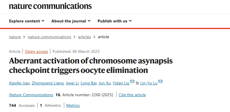 2025年3月6日,浙江大学医学院附属妇产科医院陆林宇/刘一丹团队在Nature Communications杂志上发表了题为Aberrant activation of chromosome asynapsis checkpoint triggers oocyte elimination的研究论文,揭示当HORMAD1&2异常滞留在已联会染色体轴上时,会通...
