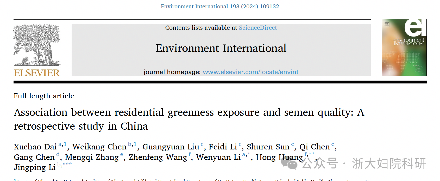 近日,浙江大学医学院附属妇产科医院男科李景平副主任医师团队联合浙江大学公共卫生学院李文渊教授团队和温州医科大学公共卫生学院黄宏教授团队,在国际权威期刊《环境国际》(Environment International,五年影响因子11.1)发表了题为"Residential greenness exposure and semen quality: The m...