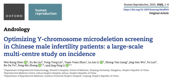 近日,浙江大学医学院附属妇产科医院男科李景平及张峰彬副主任医师团队在《人类生殖》(Human Reproduction) Top期刊发表了题为"Optimizing Y-chromosome microdeletion screening in Chinese male infertility patients: a large-scale multi-ce...