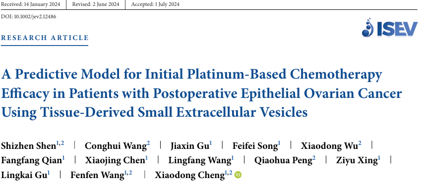 近日,浙江大学医学院附属妇产科医院程晓东教授团队在外泌体领域TOP期刊《细胞外囊泡杂志》(Journal of Extracellular Vesicles,JEV)发表了题为“A Predictive Model for Initial Platinum-Based Chemotherapy Efficacy in Patients with Postop...